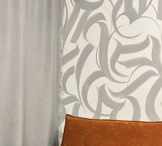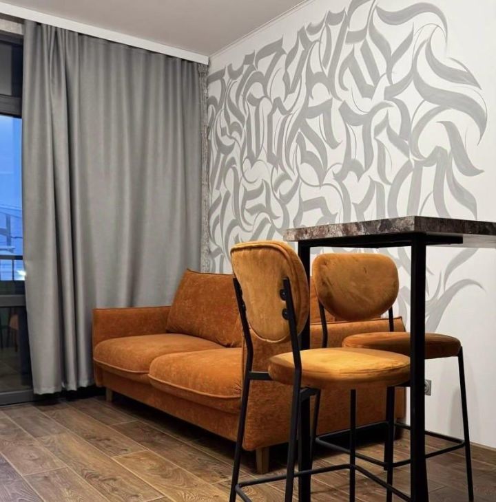 Яркие акценты в дизайне и — каллиграфия на стене, выполненная приглашённым художником, создают индивидуальную творческую атмосферу.