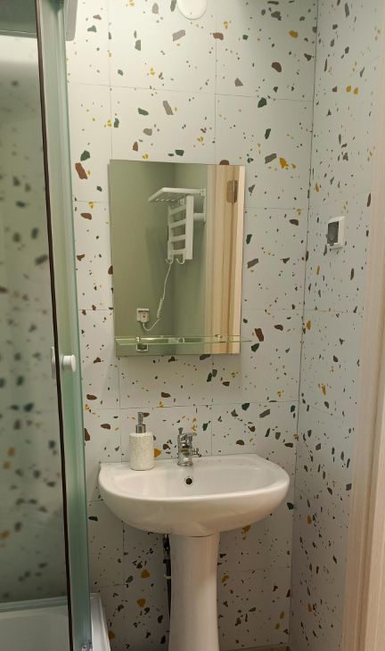 Имеется мебель и техника для комфортной жизни: эл.чайник, стиральная машина, эл. полотенцесушитель, холодильник, микроволновка, индукционная плитка с посудой, утюг, гладильная доска, напольная сушилка для белья, большой диван, просторный шкаф.