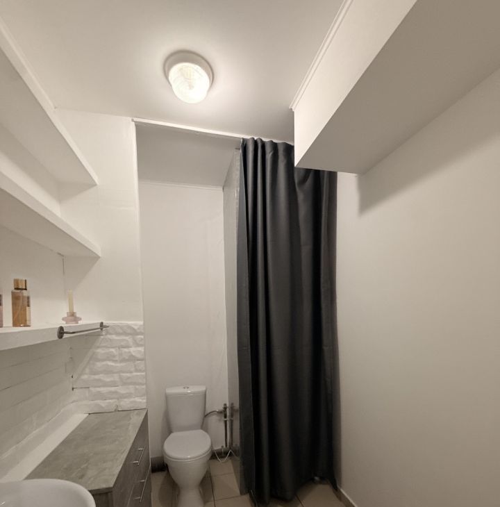 — вместо душевой за шторкой организована зона хранения с полками.