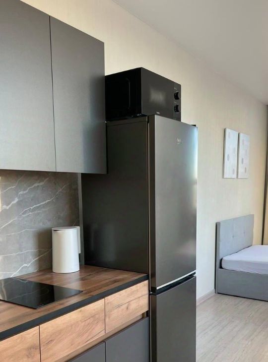 В квартире сделан евроремонт, поэтому она готова к комфортному проживанию. В студии есть вся необходимая мебель как на кухне, так и в комнате. Из техники в наличии холодильник, телевизор и стиральная машина. Санузел совмещенный, с душевой кабиной. Окна выходят как на улицу, так и во двор, что обеспечивает хорошее естественное освещение.