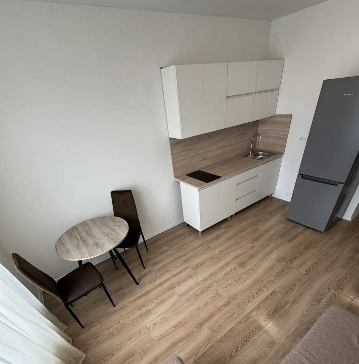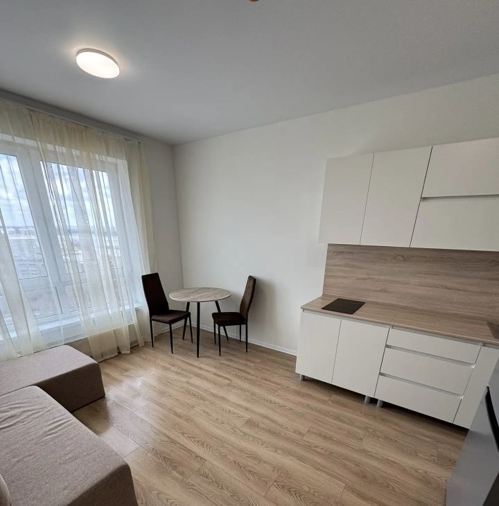 В студии есть все необходимое для комфортного проживания: кухонный гарнитур с варочной поверхностью, холодильник, стиральная машина, диван, стол и стулья.