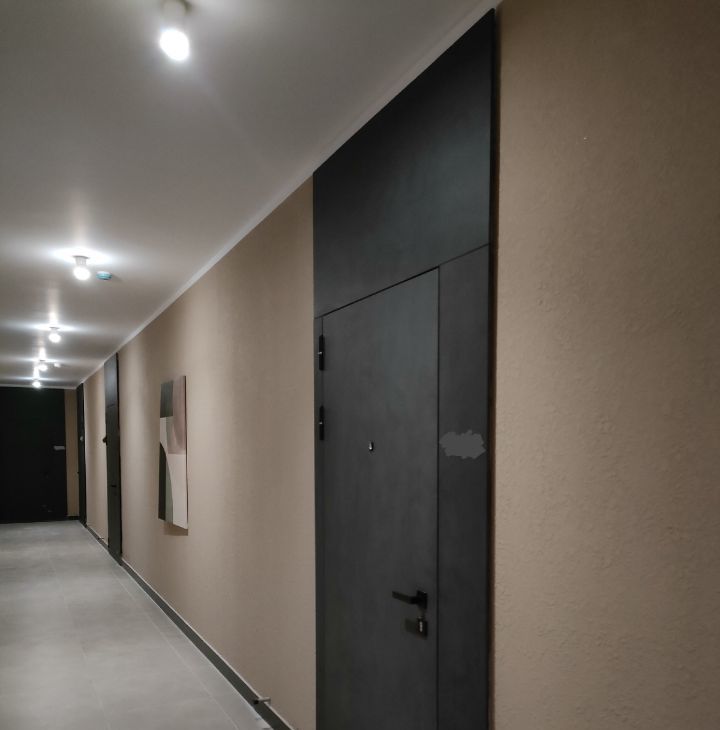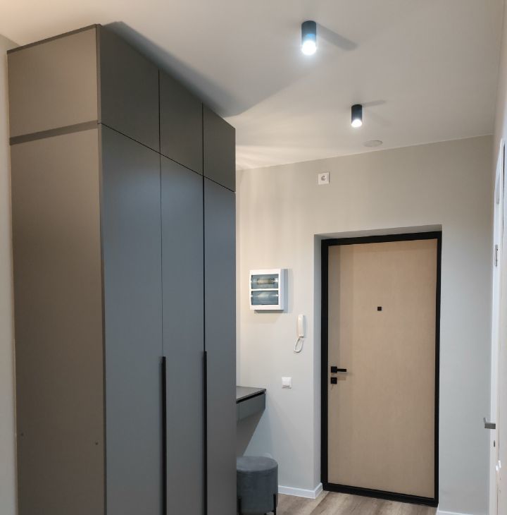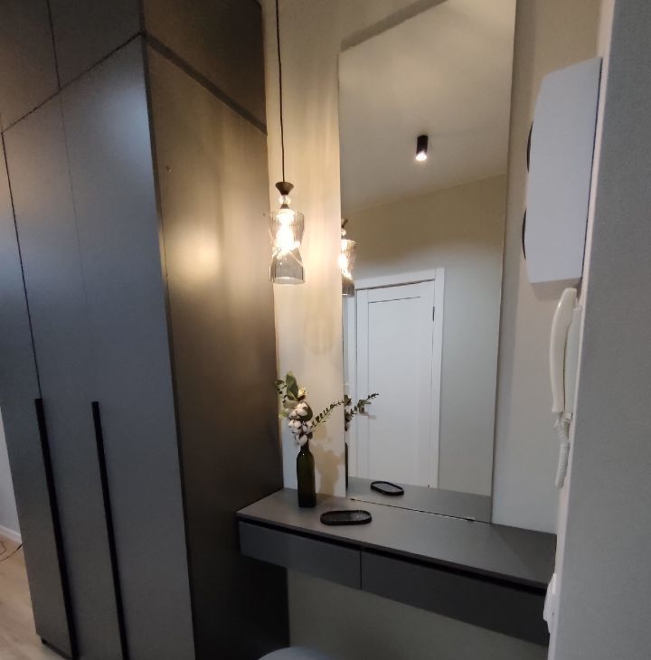 С порога студия встречает красивой зоной с большим зеркалом, декоративным светильником и туалетным столиком, для обуви и верхней одежды предусмотрен высокий шкаф до потолка, что предотвращает визуальный шум. В квартире несколько сценариев освещения благодаря разноплановым источникам света, включая диммируемый торшер.
