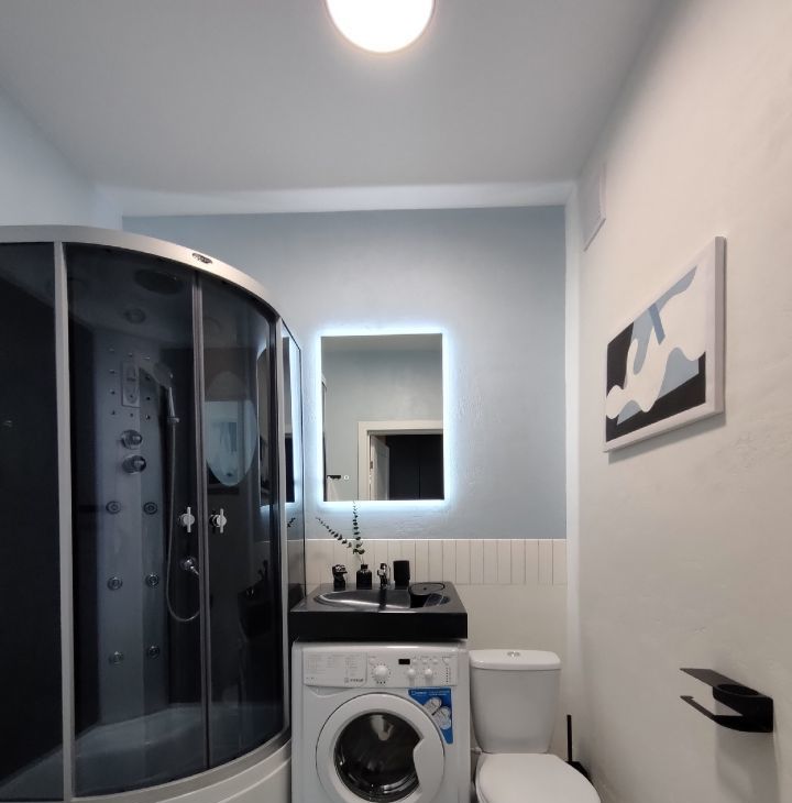 В ванне авторская отделка стен, зеркало с подсветкой, душевая кабина с тропическим душем, радио и подсветкой, теплый пол, регулировка температуры освещения (3 режима), много мест хранения.