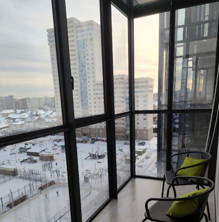 Просторный панорамный балкон 5,8 кв.м, в летний период можно проводить вечера за чашечкой кофе с видом на огромный двор и город. В ЖК один из самых больших дворов города 2,8 ГА, в котором 2 катка для жителей - можно кататься на коньках в любое время, спортивная площадка с тренажерами, лаундж зона в европейском стиле с теннисным столом и беседками, на территории ЖК живые многолетние ели, высаженные вокруг двора.