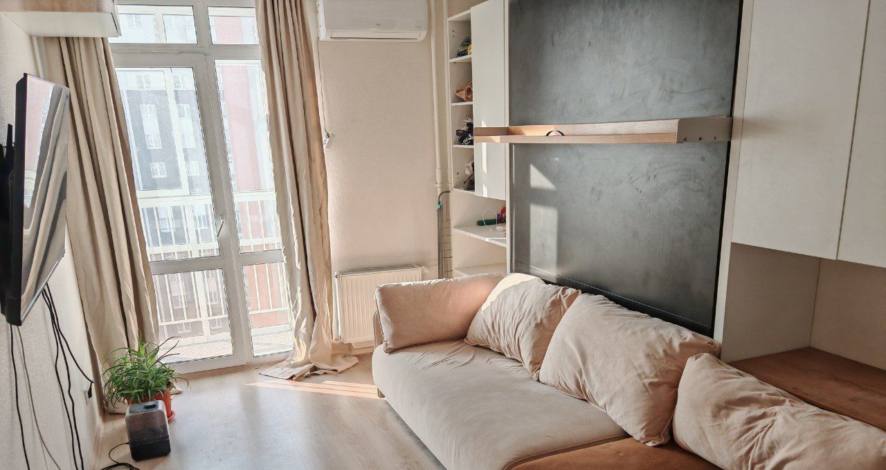 Длинный диван, большой телевизор, инверторный кондиционер, благодаря которому есть все преимущества солнечной стороны без жары летом