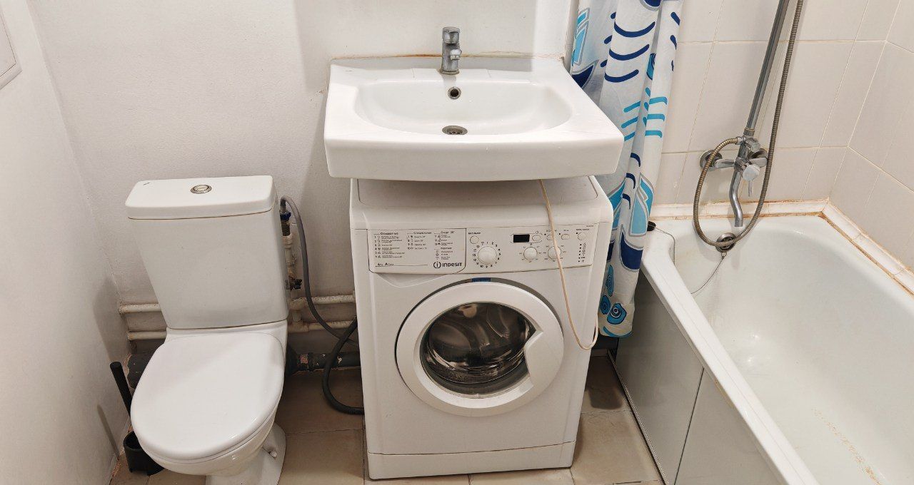 Большое окно в пол, много места в ванной за счёт удобного расположения стиральной машины