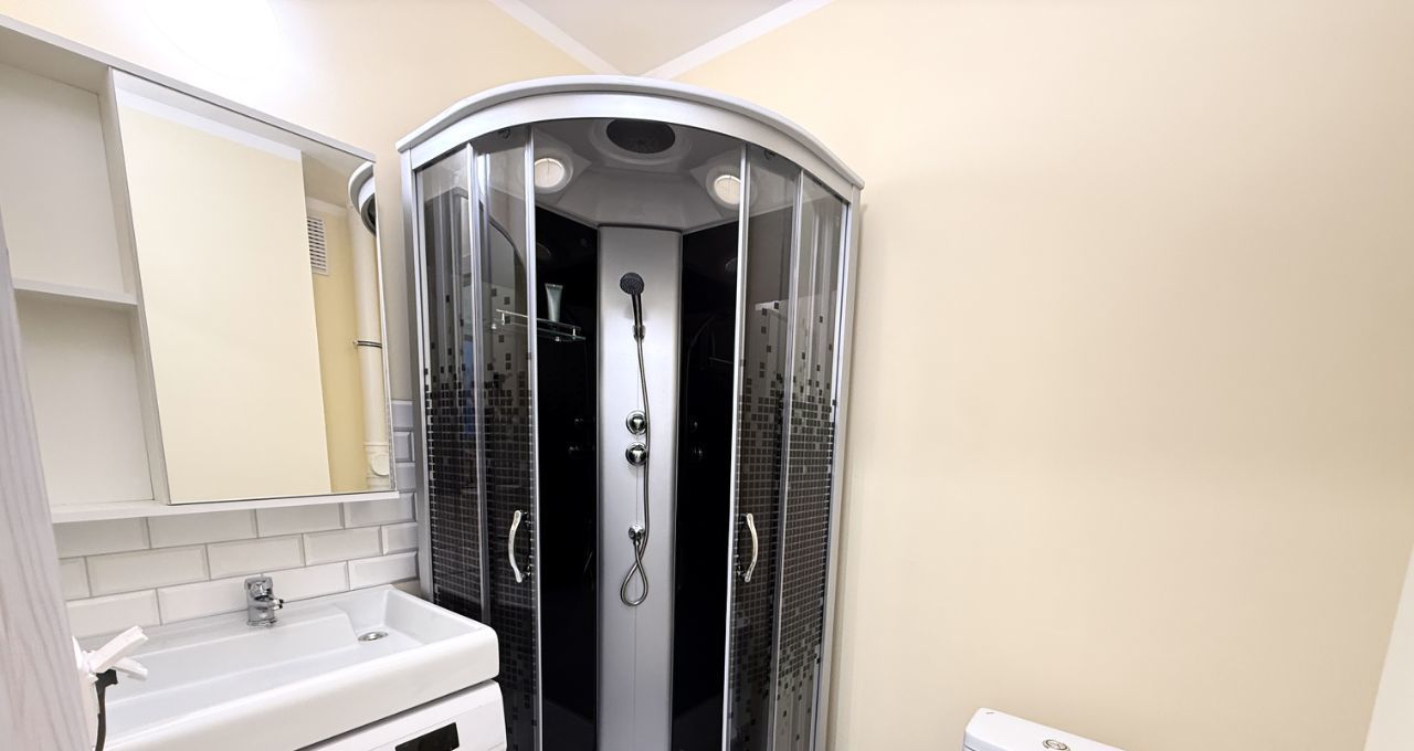 В квартире есть: стиральная машинка, душевая кабина, холодильник, плита, вытяжка, кухонный гарнитур, диван, шкаф, стол; стеллаж, табуретки. Вся мебель и техника новая.