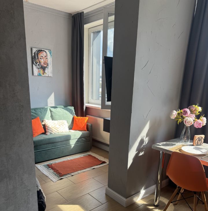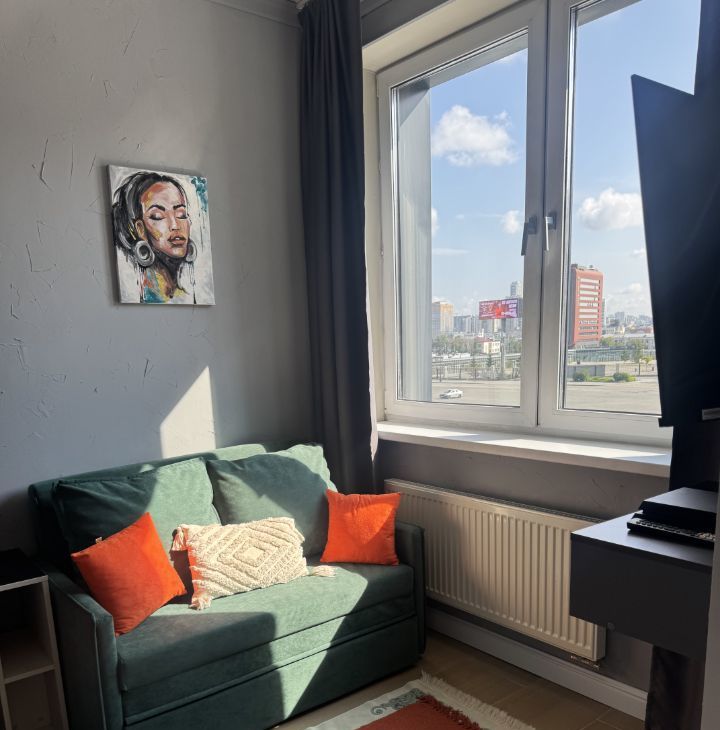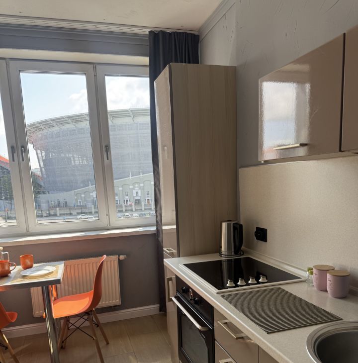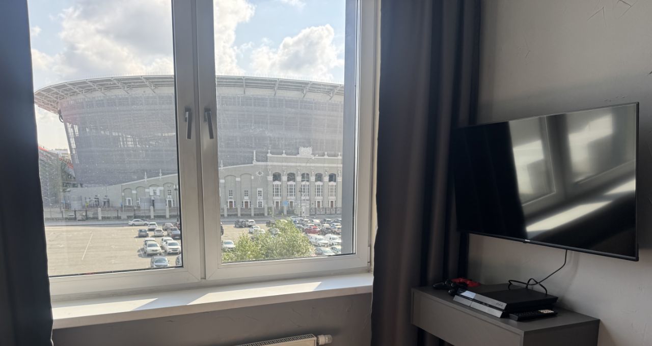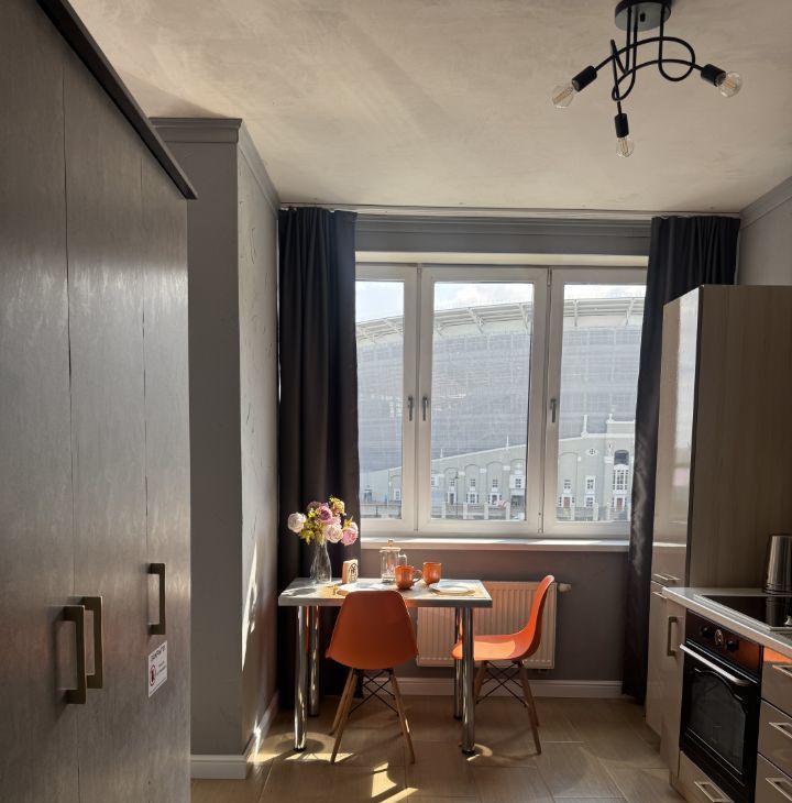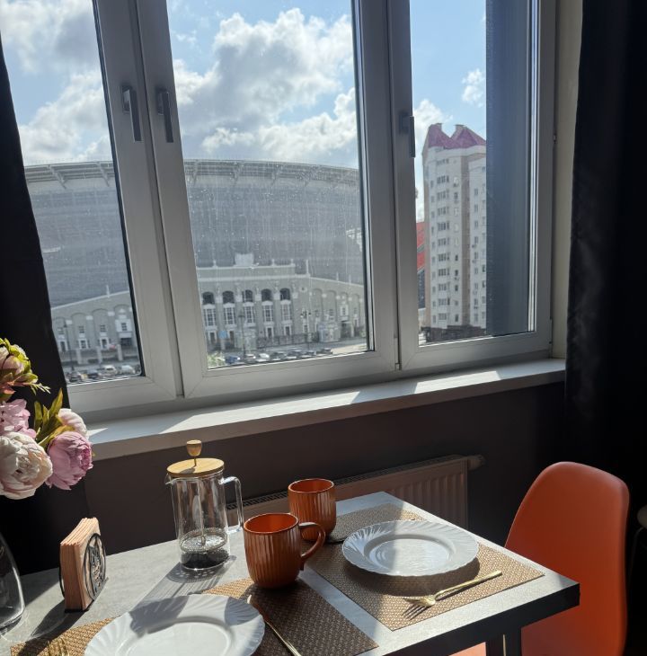 Наша современная стильная студия расположена прямо напротив центрального стадиона — вид из окна подарит ощущение, что вы сидите на трибуне во время матча!