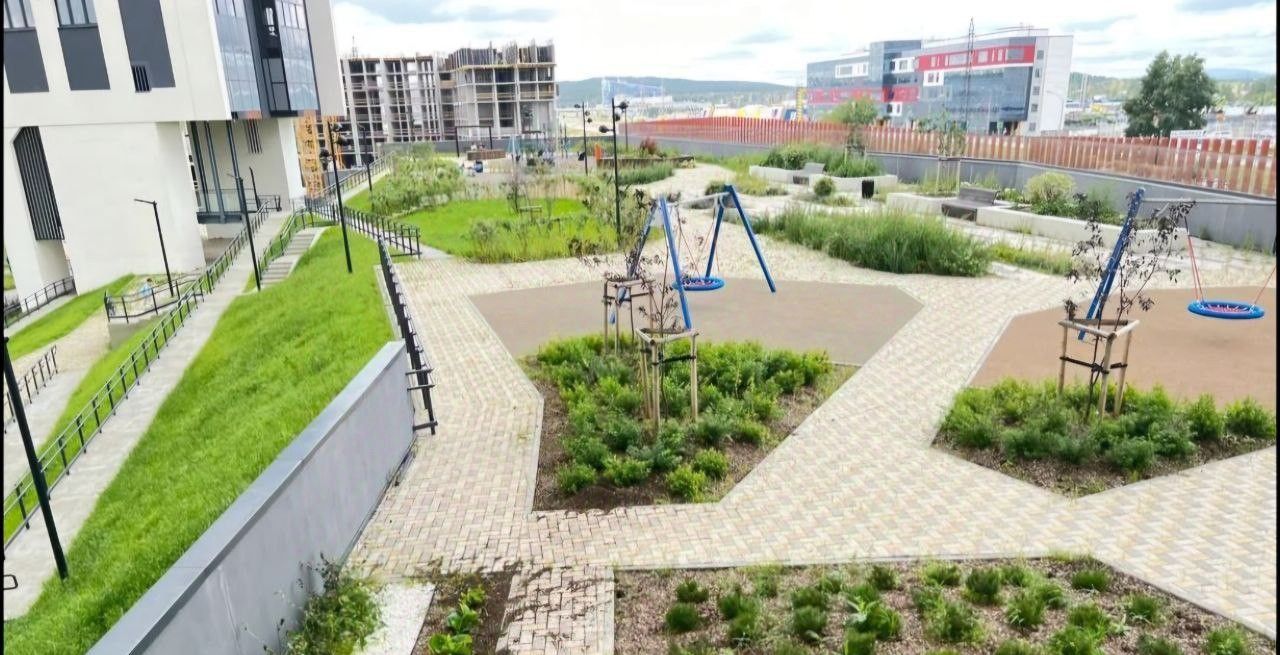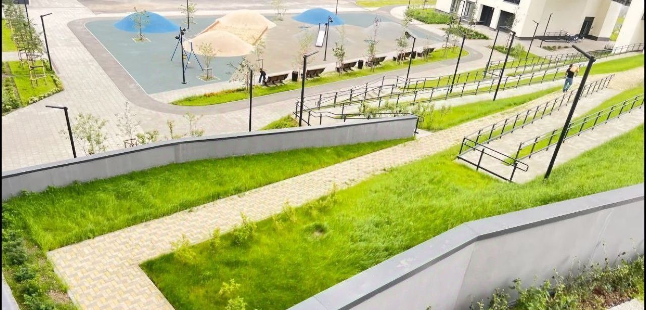 Огороженный просторный двор с современным благоустройством. В доме охрана и система видеонаблюдения. Наземный паркинг, где есть предложения по аренде машиномест.