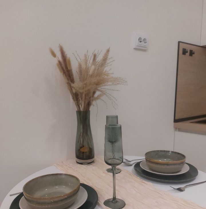• Кухонный гарнитур, обеденный стол и стулья, удобный раскладной диван, письменный стол, посуда.