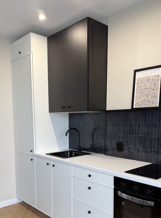 Полностью укомплектована техникой: стиральная машина, духовой шкаф, холодильник.