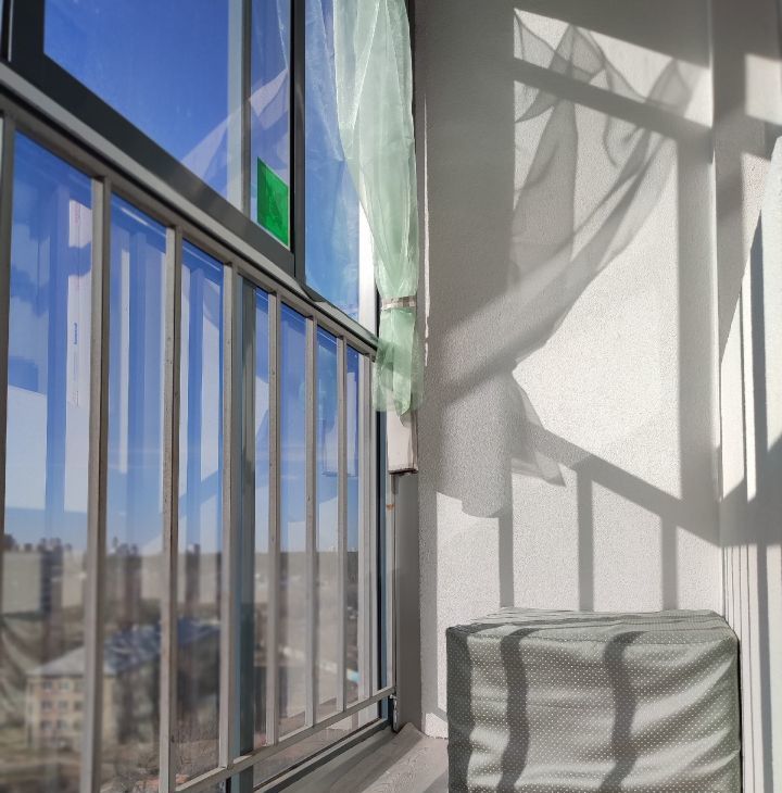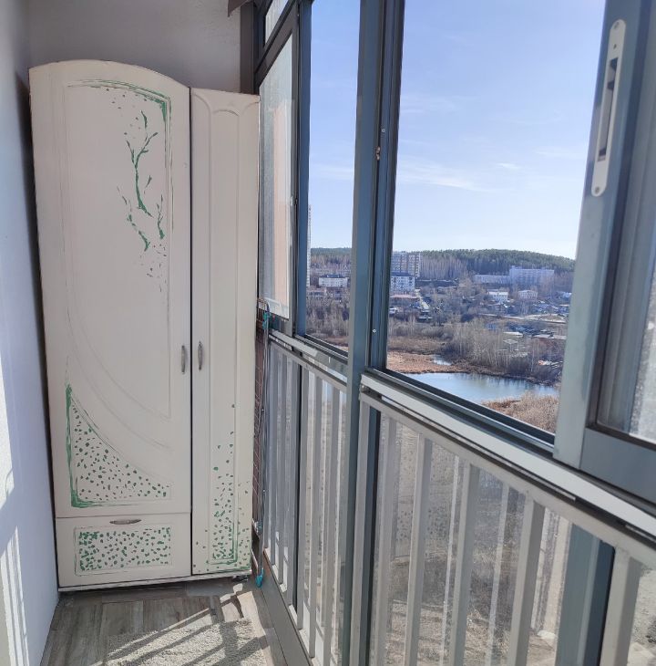 ЛОДЖИЯ. Застекленная. Панорамные окна в пол. Здесь есть дополнительный двухстворчатый шкаф и кресло-пуфик.