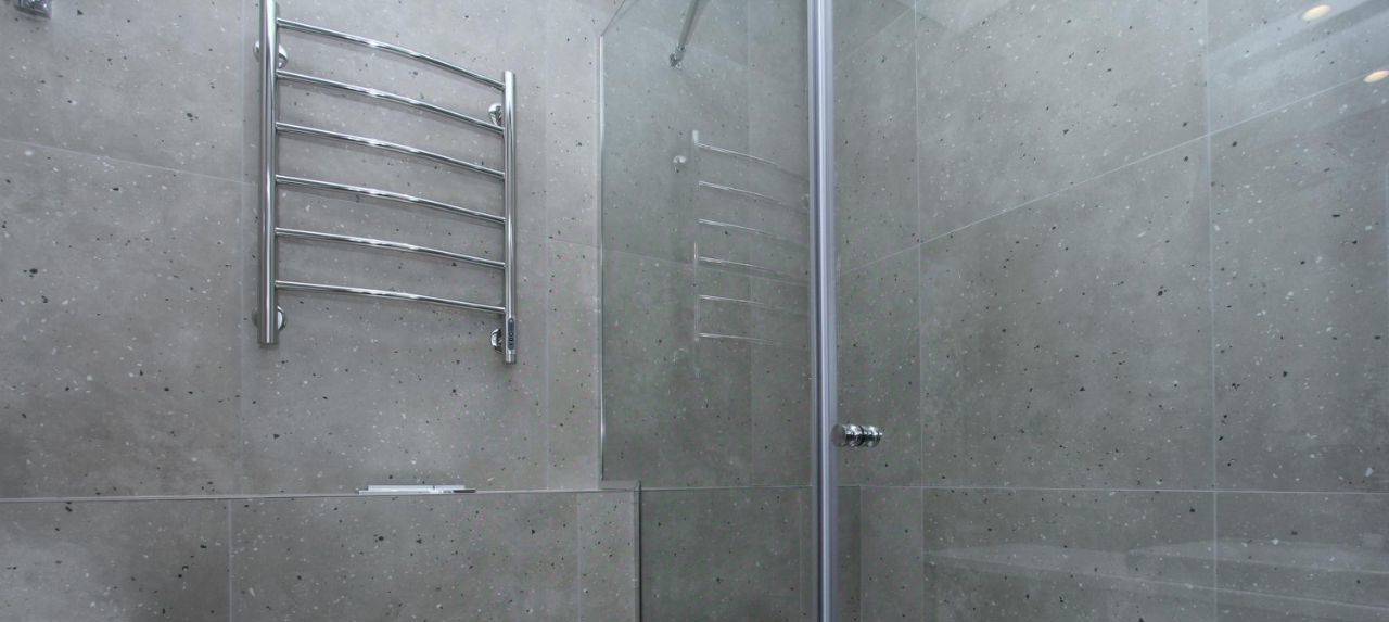 В студии совмещенный санузел с душевой кабиной, а также раковиной с зеркальной подсветкой.