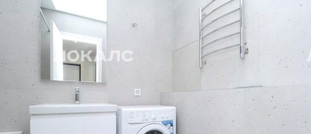 В студии совмещенный санузел с ванной, стиральной машиной, а также раковиной с зеркальной подсветкой.