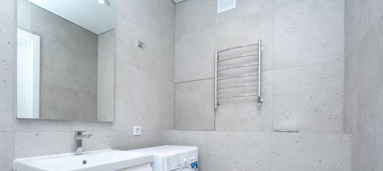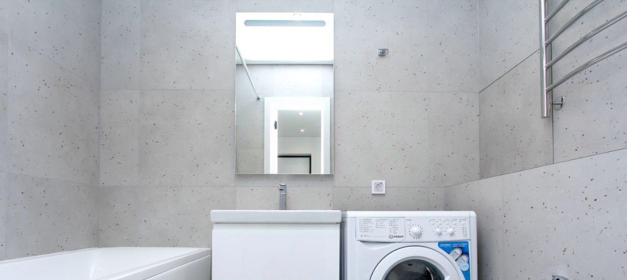 В студии совмещенный санузел с ванной, стиральной машиной, а также раковиной с зеркальной подсветкой.