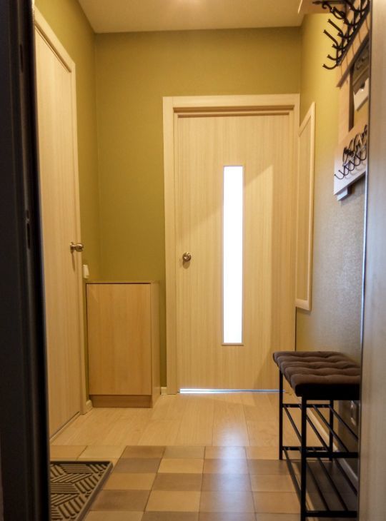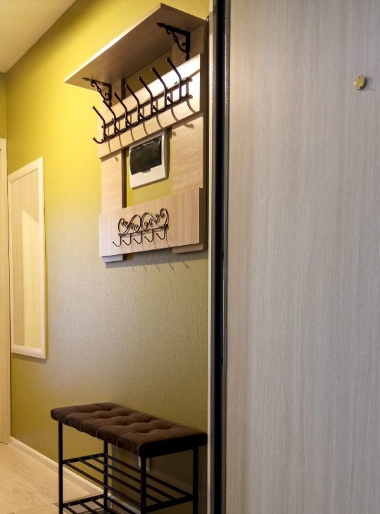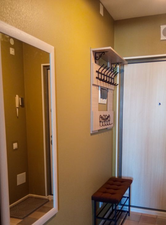 В коридоре вешалка для одежды, обувница, тумба, большое зеркало.