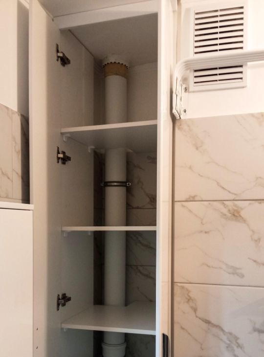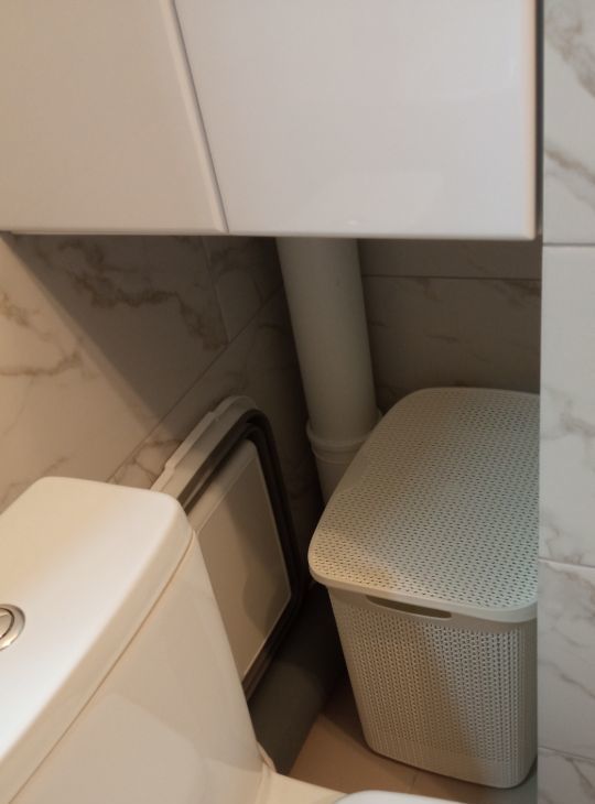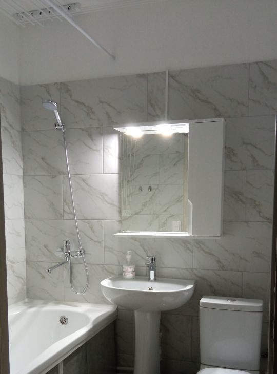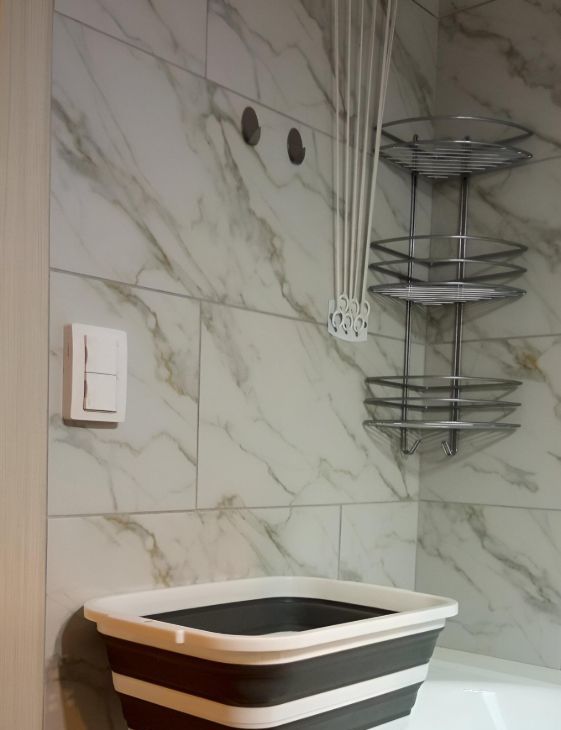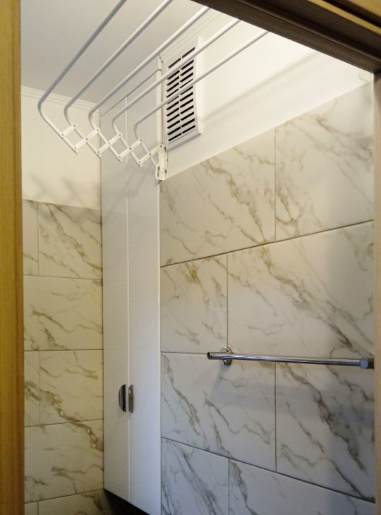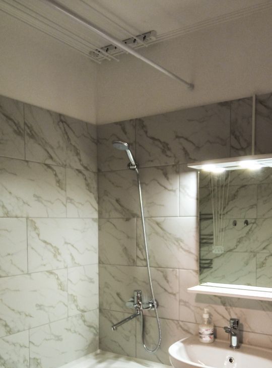 Санузел совмещён, установлена акриловая ванна, есть вместительный шкаф, потолочная сушилка для белья и раздвижная сушилка.