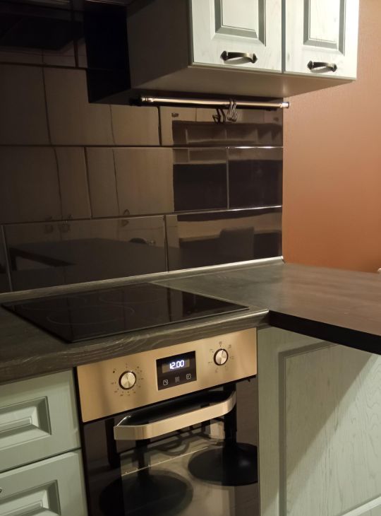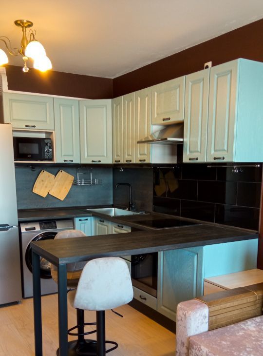 В кухне кухонный гарнитур с подсветкой по периметру рабочей поверхности и с барной стойкой, холодильник, микроволновка, варочная поверхность на три конфорки, духовка, вытяжка, стиральная машина, электрочайник.