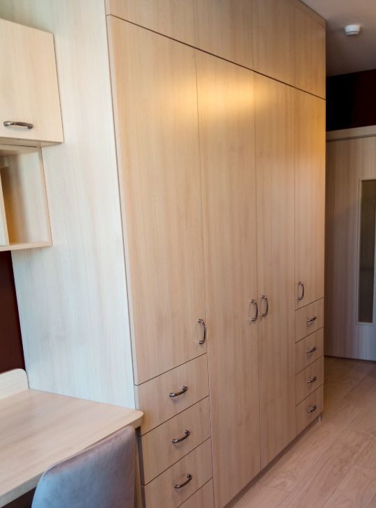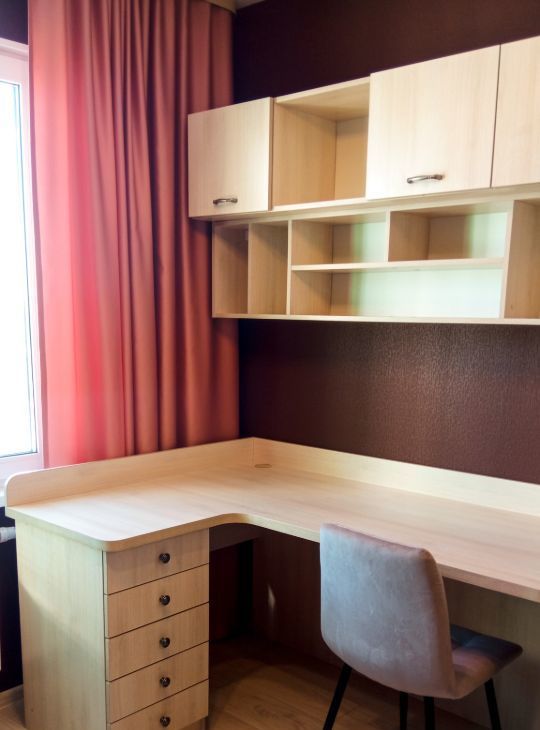 В комнате - вместительный шкаф, ортопедический диван со спальным местом 160х200, рабочий стол с навесными полками, тумба, лестница.