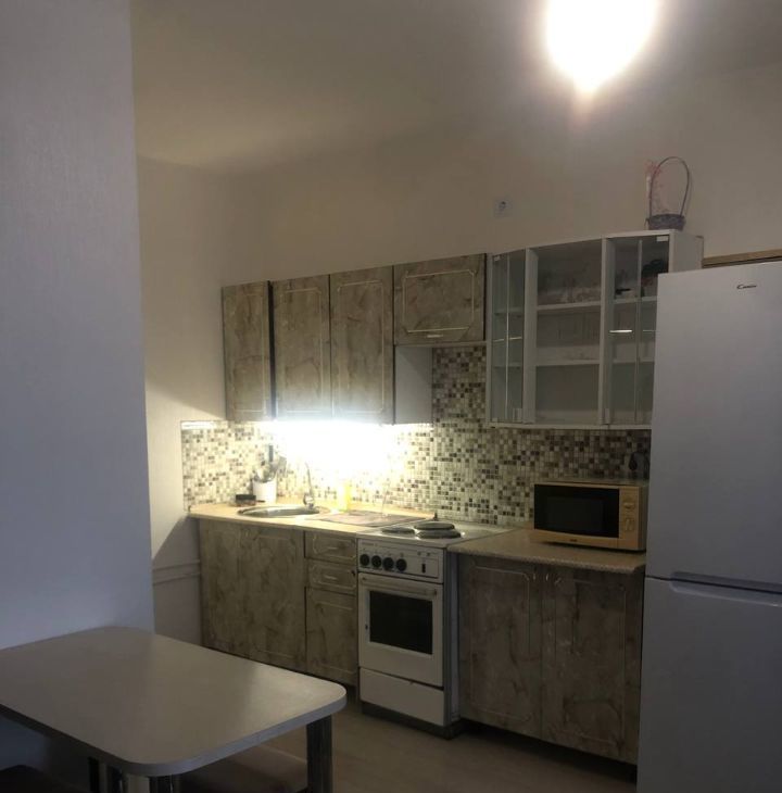 - Квартира обставлена всем необходимым для комфортного проживания (стиральная машина, холодильник, микроволновка, плита с духовкой, кровать, шкаф-купе, шкаф в прихожей, обеденный стол со стульями, кухонный гарнитур);