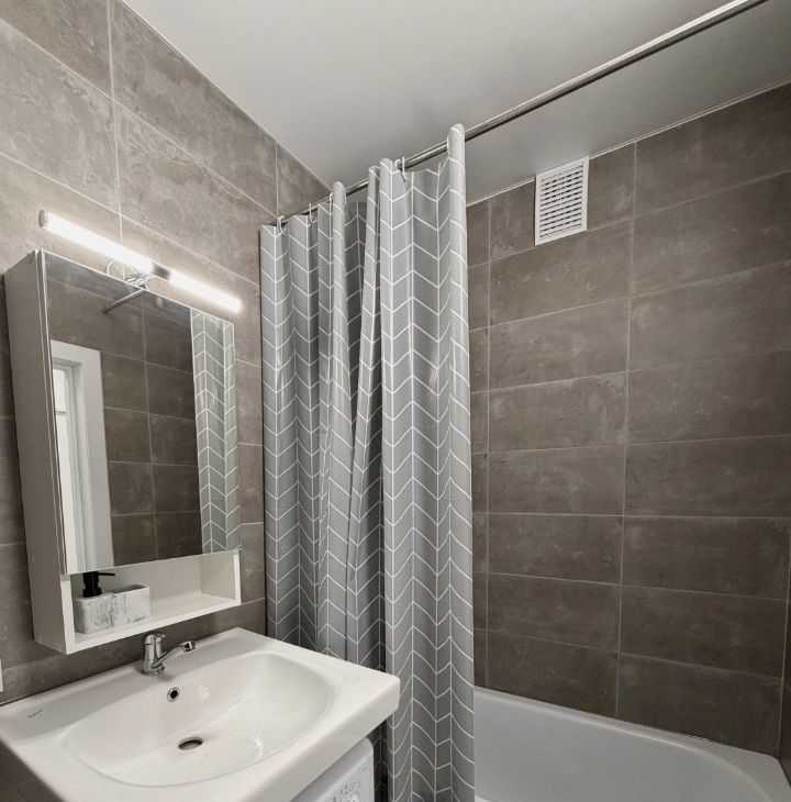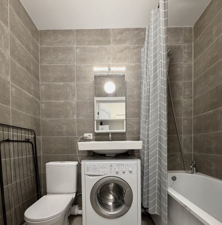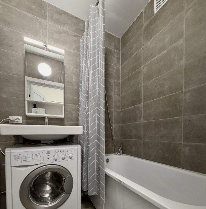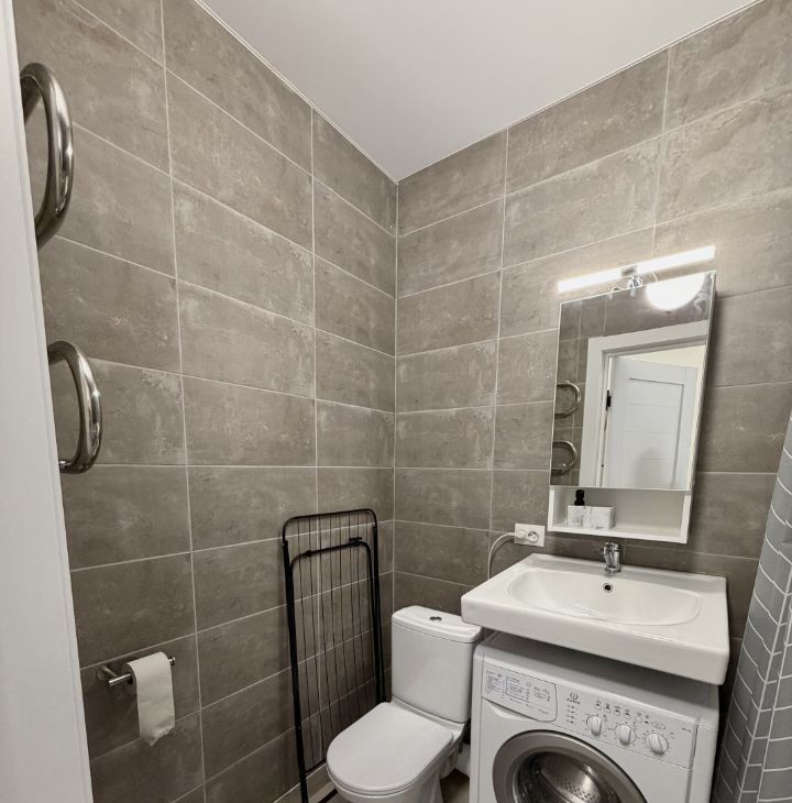 В ванной комнате выложена плитка, стоит стиральная машина, подвесной шкаф с зеркалом.