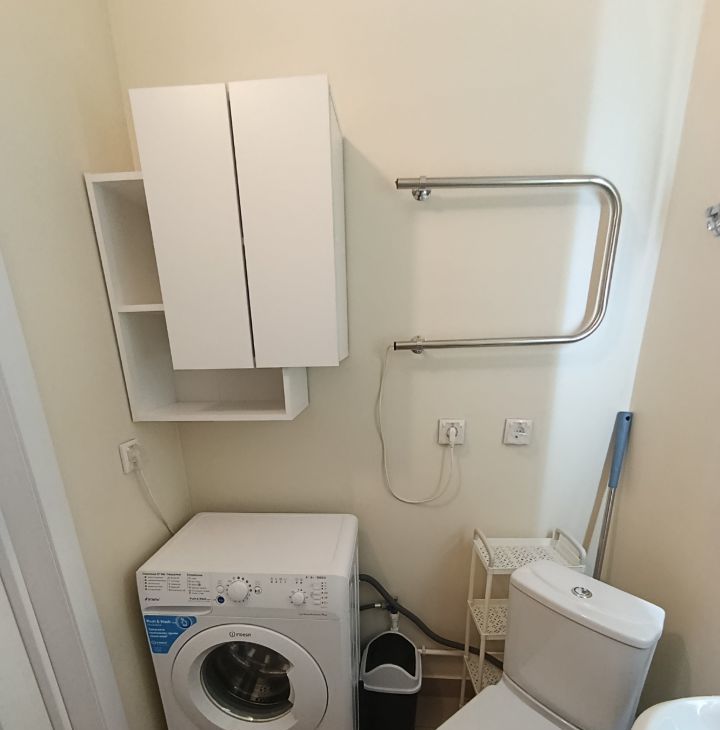 В ванной стены покрыты лаком - краска не облезет от воды. Стиралка с унитазом никак не мешают друг другу. Огромный шкаф - 320*220*50 с двумя штангами и множеством полок. Стол раскладной - можно сделать больше или совсем сложить. Вентилятор, большая бельевая сушилка. Остальное на фото.