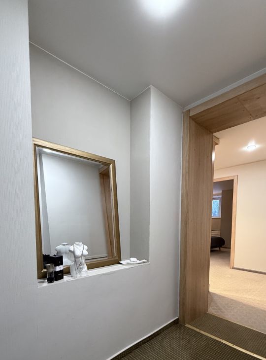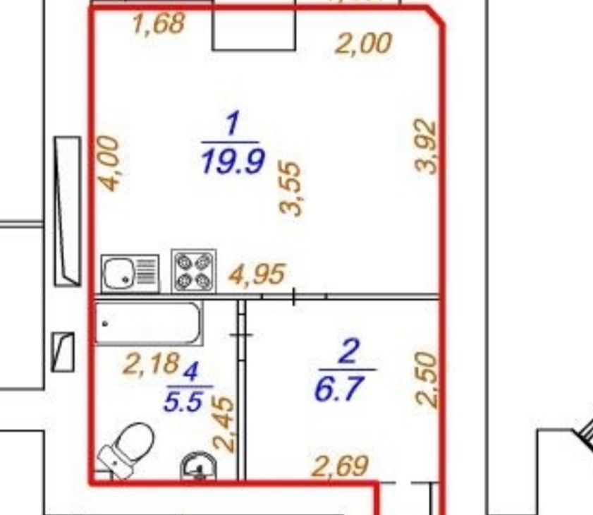 - 35 м2 (большая кухня - гостиная с эркерным окном, большой с/у, два коридора - один при входе, для верхней одежды и обуви, далее гардеробного типа с купейным шкафом)